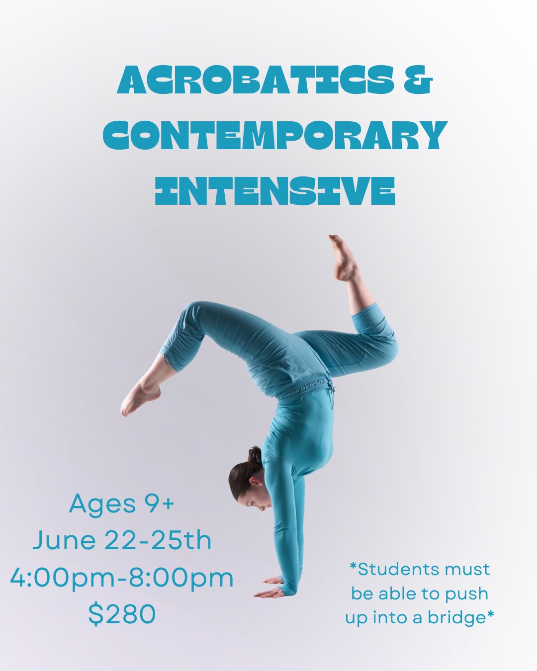 A workshop focused on Acrobatics and Contemporary techniques. Includes: daily classes in acro, contemporary, flexibility, and choreography will be taught for demonstration on the last day.